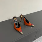 RED GEM-STUDDED SLINGBACK PUMPS IN ORANGE PATENT CALFSKIN