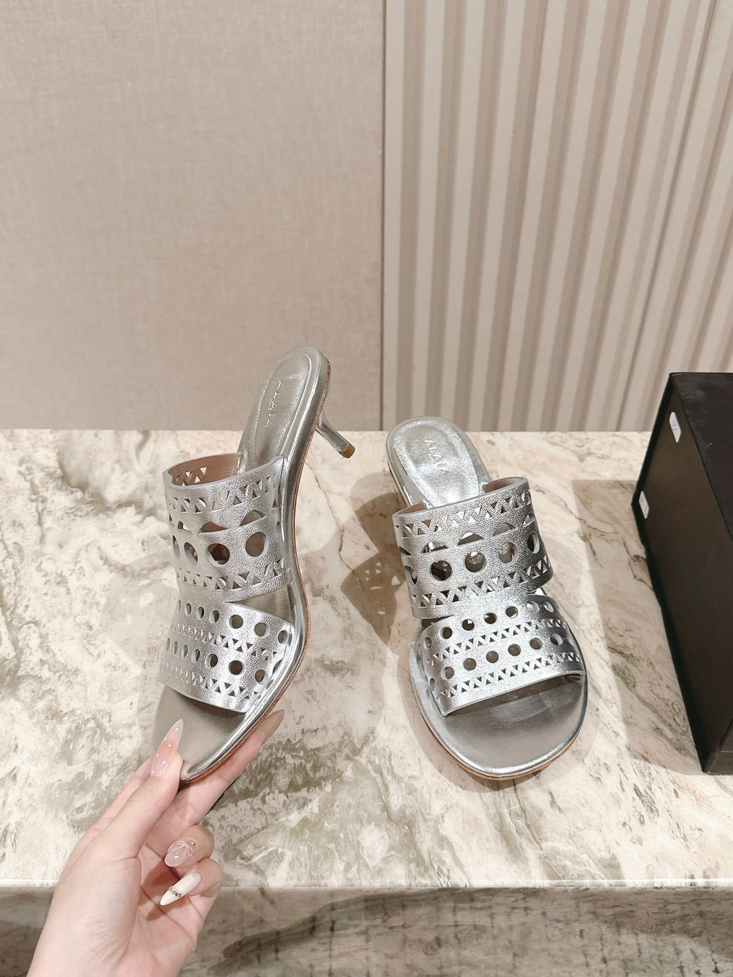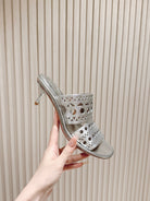 Alaia 2025 Vienne Cutout Kitten-Heel Slide Sandals Silver Leather 293647