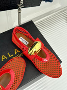 ALAIA MARY JANE SHOES IN CHERRY RED MESH WITH GOLD HARDWARE
