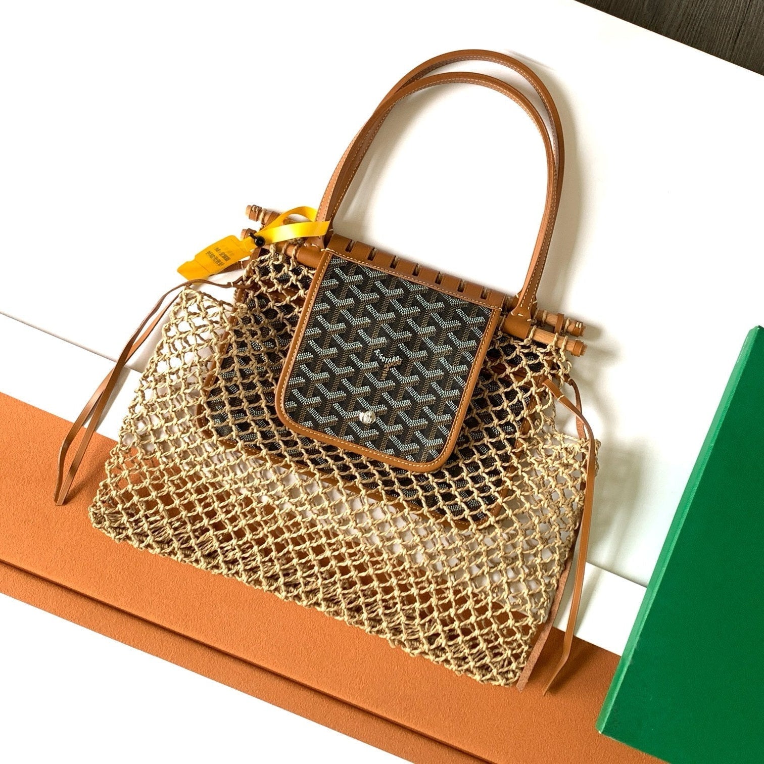 • Material: Woven raffia and calfskin
