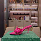 BOW-EMBELLISHED HIGH MULES IN HOT PINK SHEEPSKIN