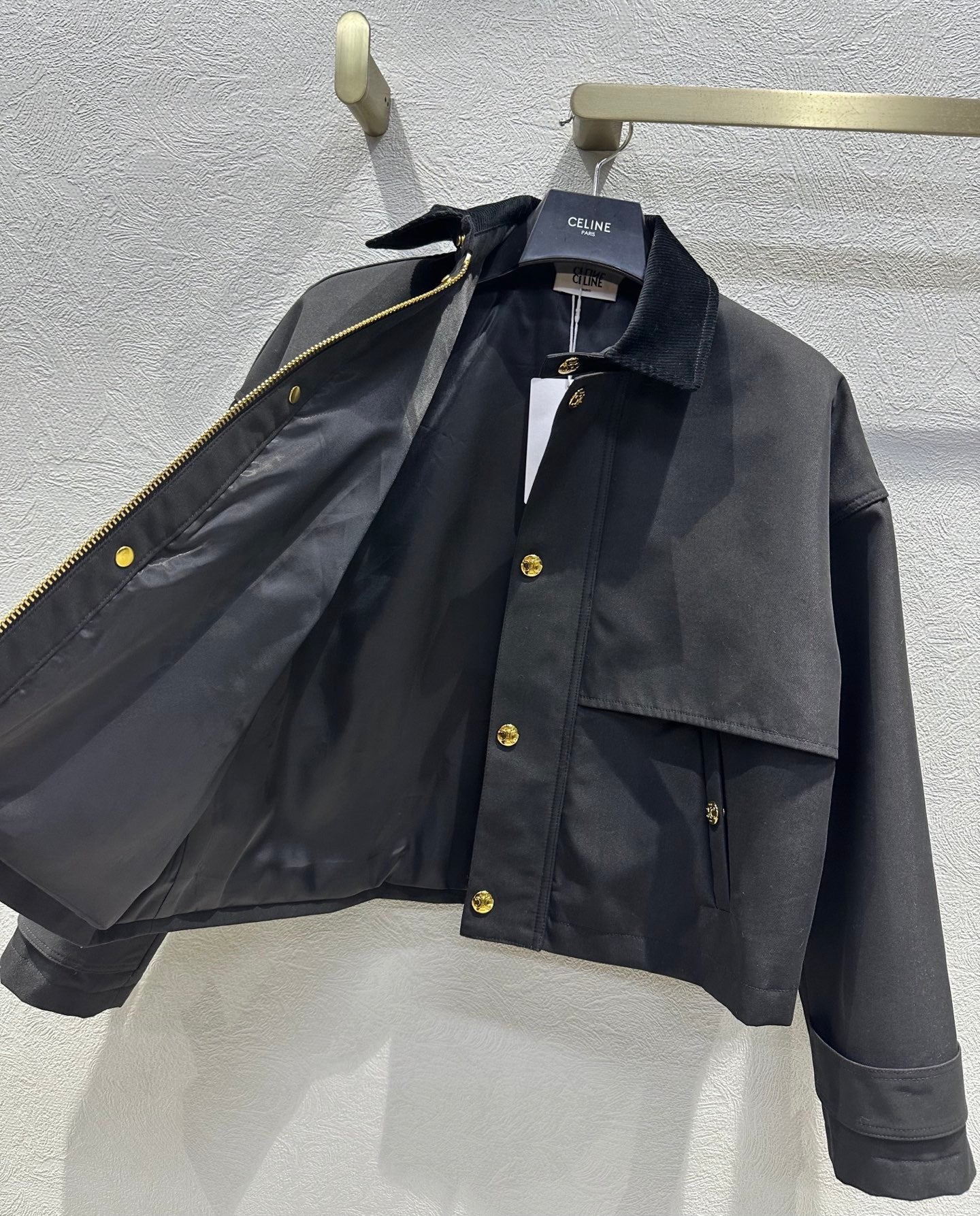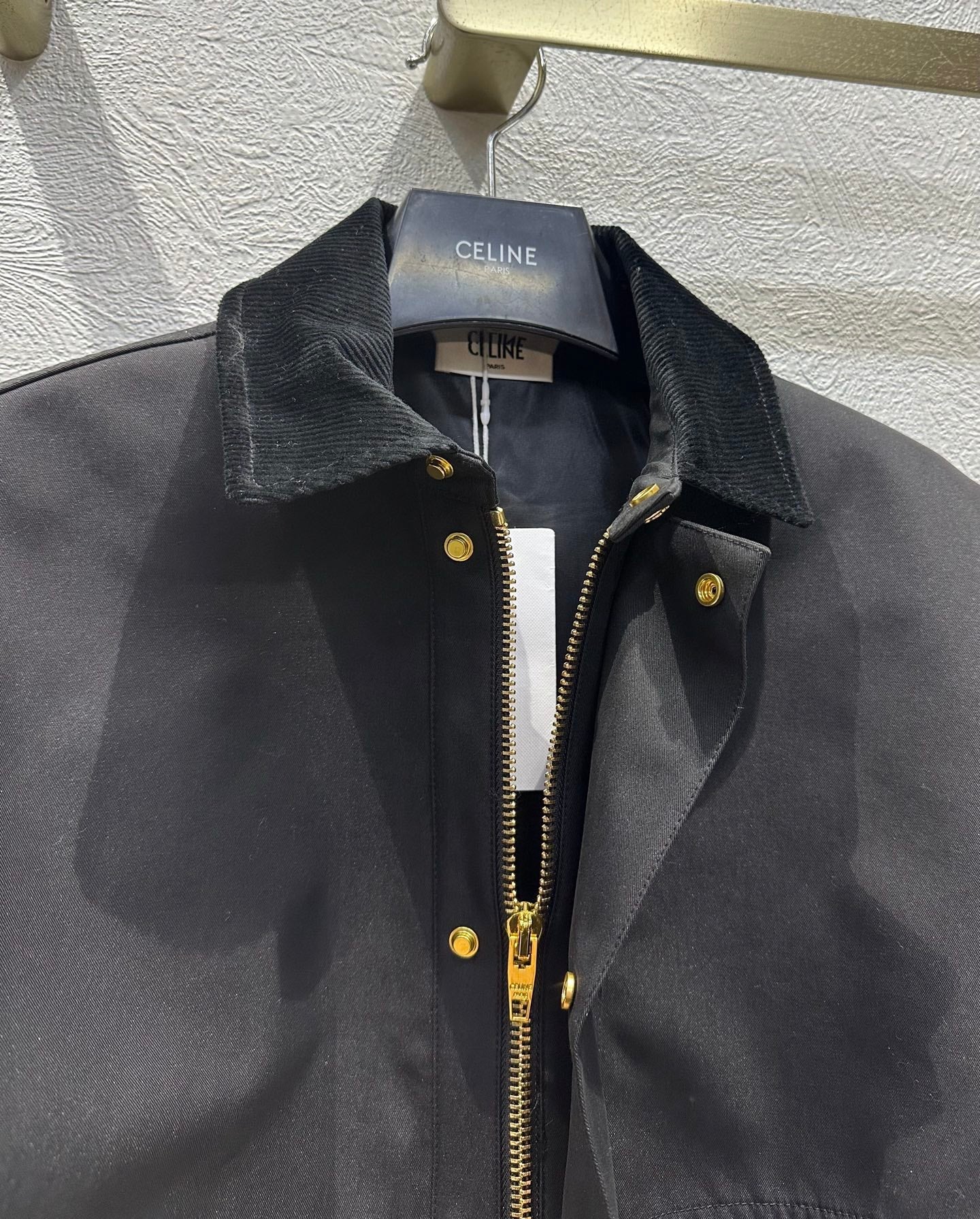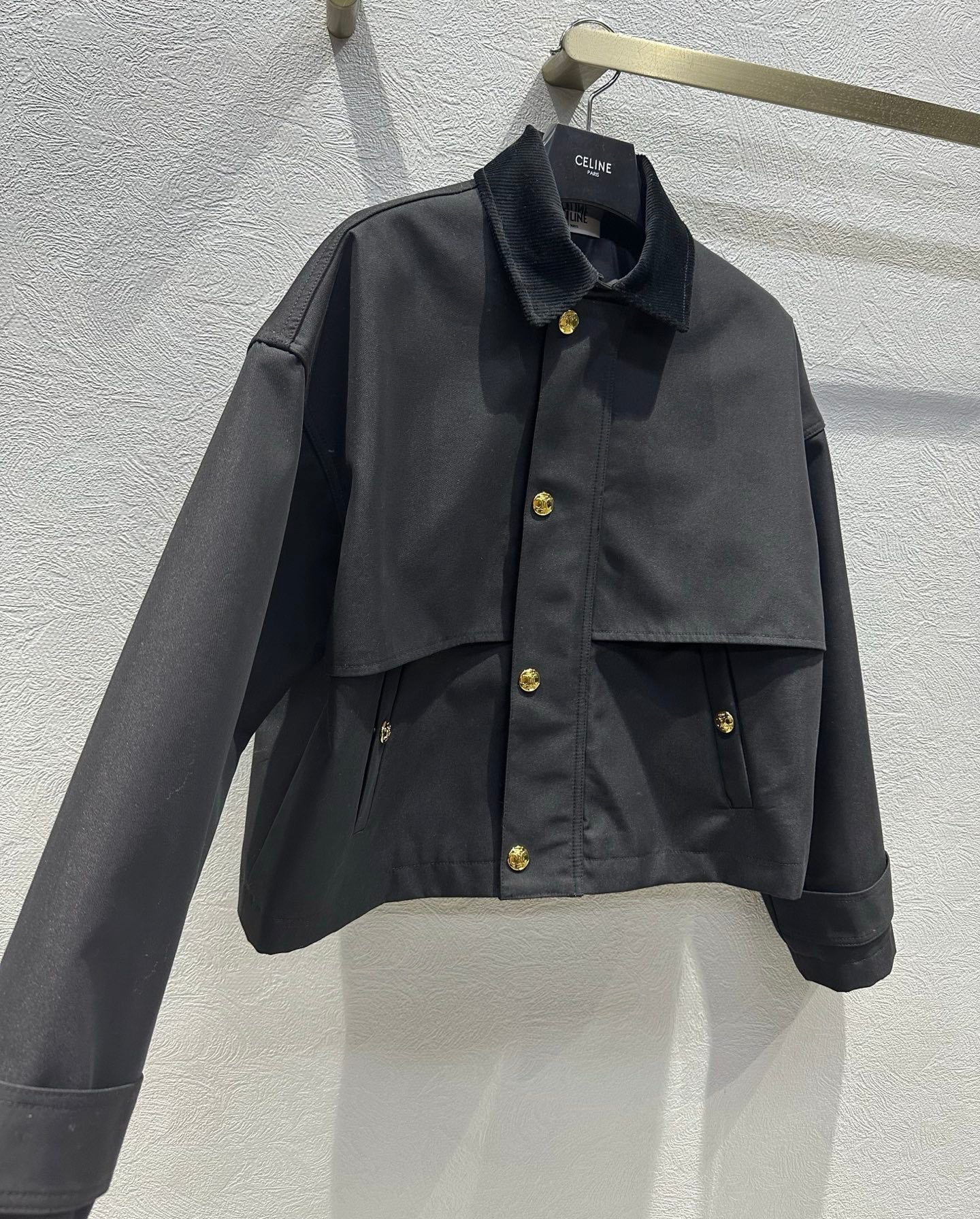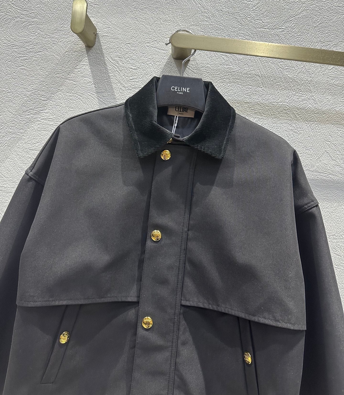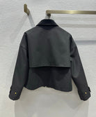 Celine 25 Lapel Short Trench Coat Black Gold Cotton Polyester