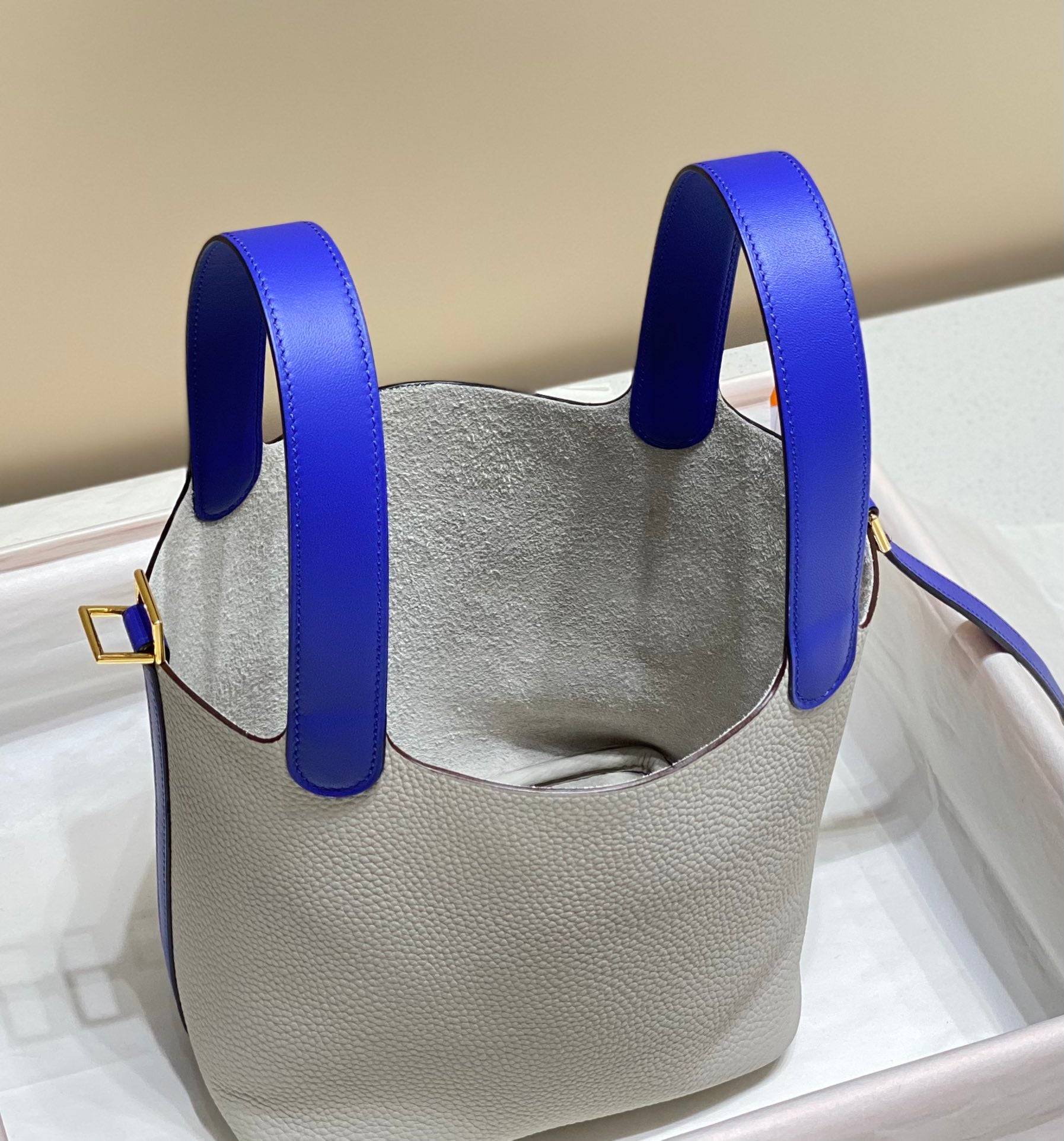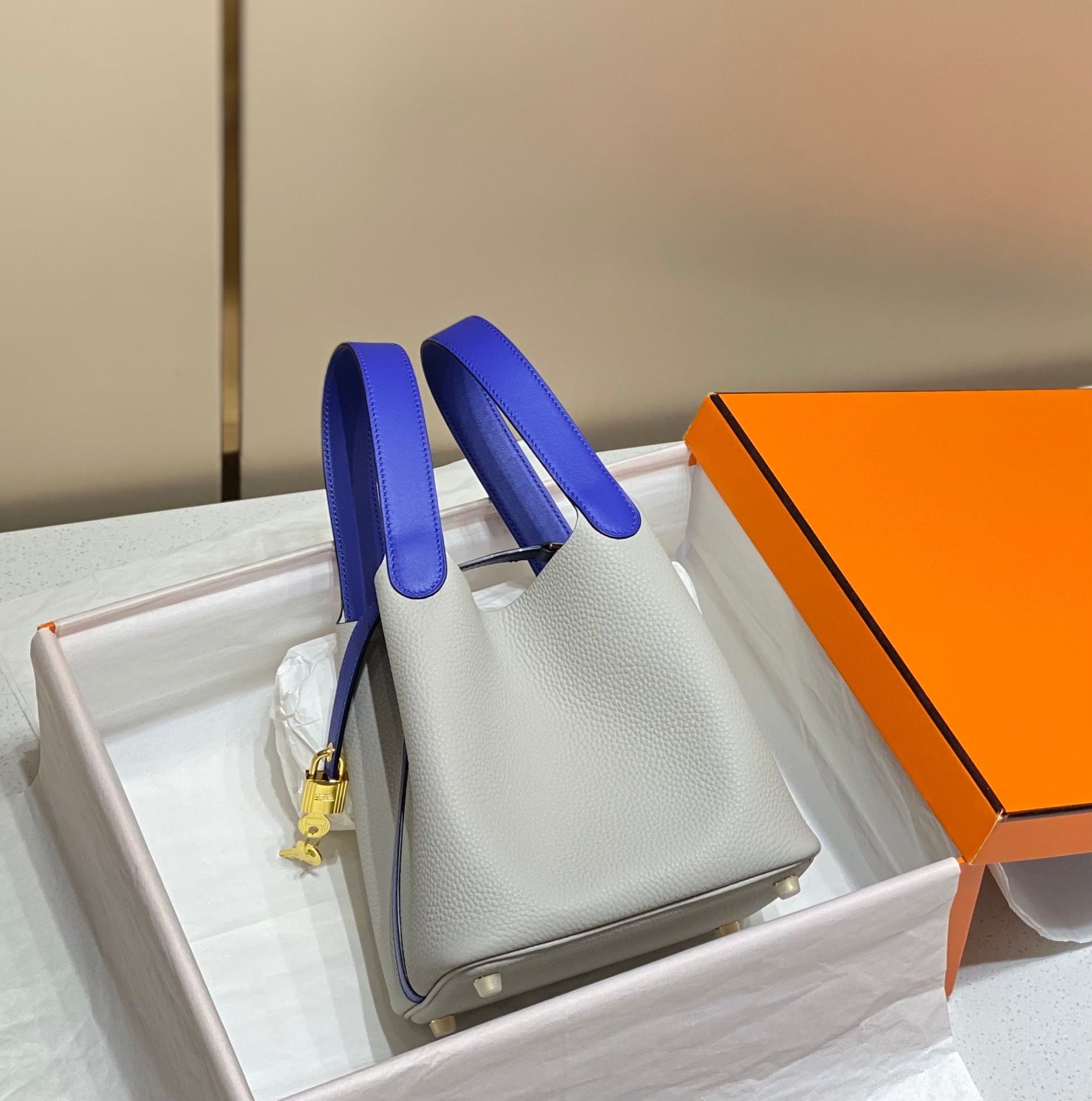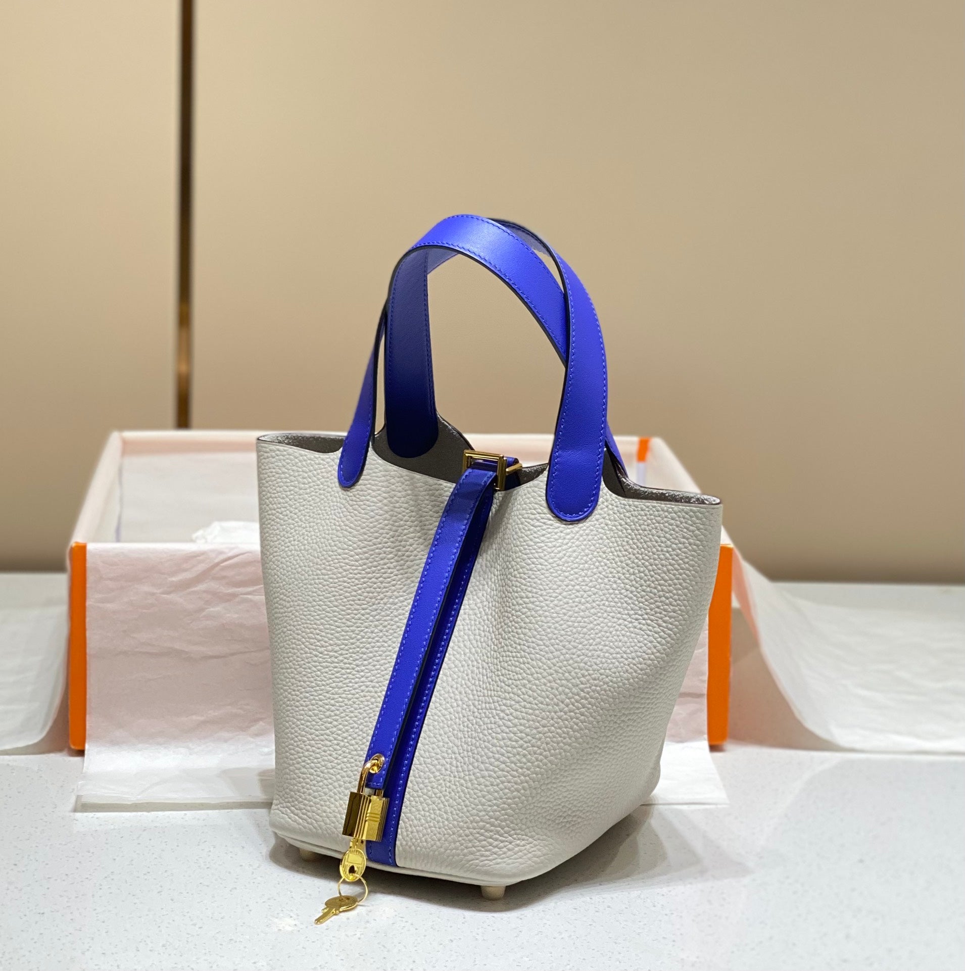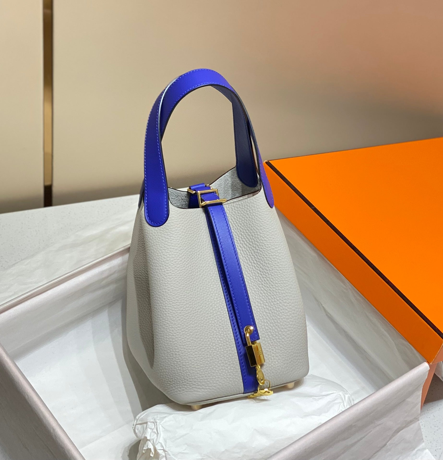 HM Pegase Pop Herbag Zip 31 White Blue Canvas Black Cowhide Leather