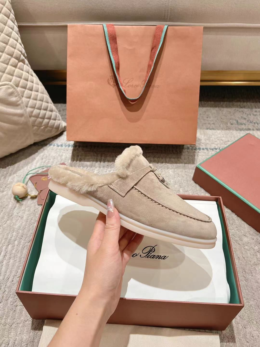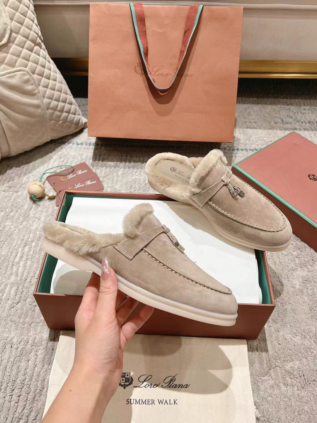 LP Charms Walk Babouche Loafer Sand Brown Suede With Rabbit Fur Lining 206226